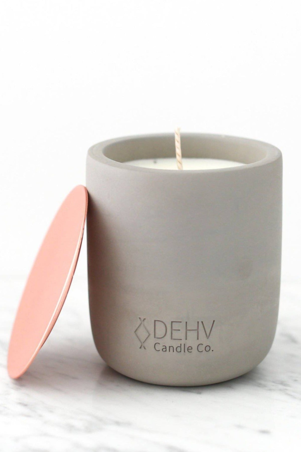 DEHV candles are ethically created and hand poured into concrete vessels with a metal copper lid. Concrete is a natural material, therefor each vessel will have its own unique character.