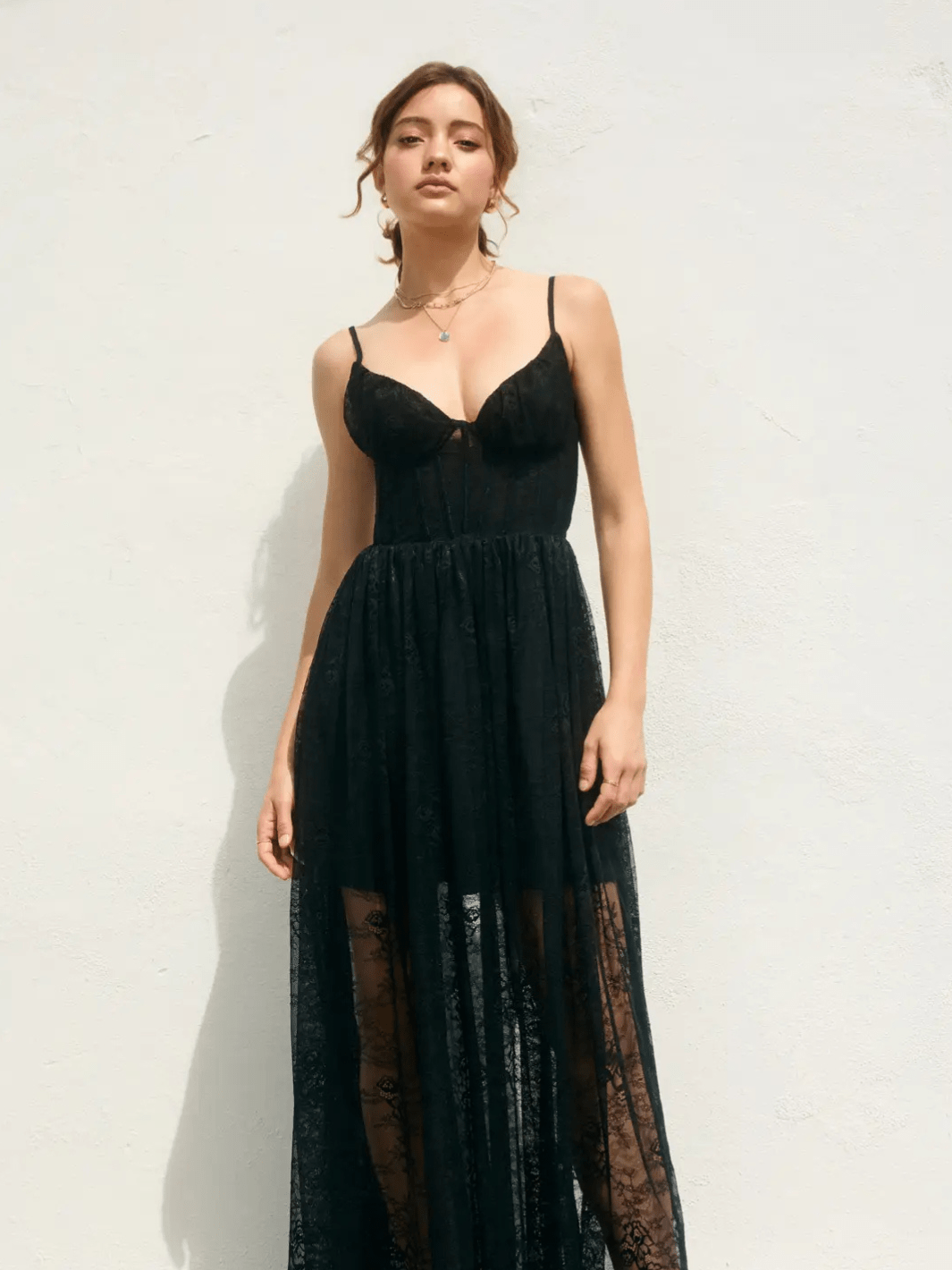 • Fitted corset bodice with shirred cups and soft boning