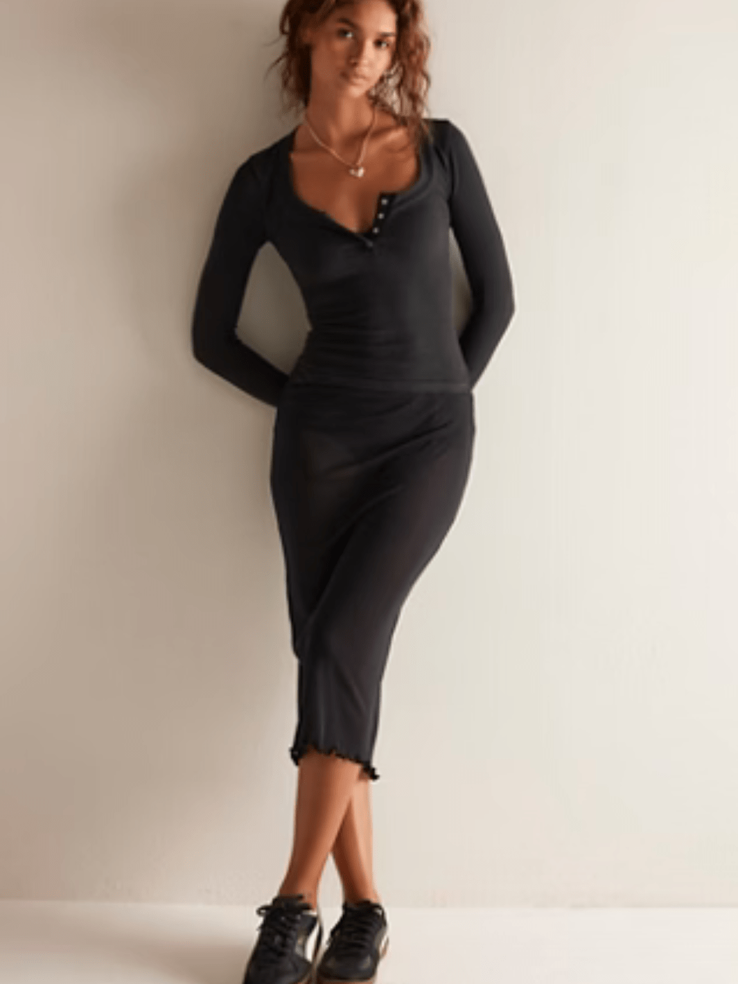 This sleek, buttery-soft long-sleeve is about to become your layering ride-or-die. Made from a stretchy ribbed cotton blend, it hugs just right without feeling tight. The scoop neckline keeps things feminine, while the functional button-front closure lets you style it your way. Short side slits add comfort and movement, making this top insanely easy to wear with denim, skirts, cardigans, or oversized jackets. Form-fitting, flattering, and made to move with you.