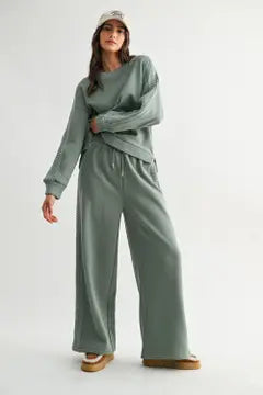 The top features an oversized fit with ribbed cuffs and hem for that perfectly slouchy drape we all love. Along the sleeves and pant legs, a braided trim adds subtle texture and a refined, boutique-level finish. The wide-leg pants are designed with an easy elastic waistband, keeping you comfortable from morning coffee runs to cozy evenings in.