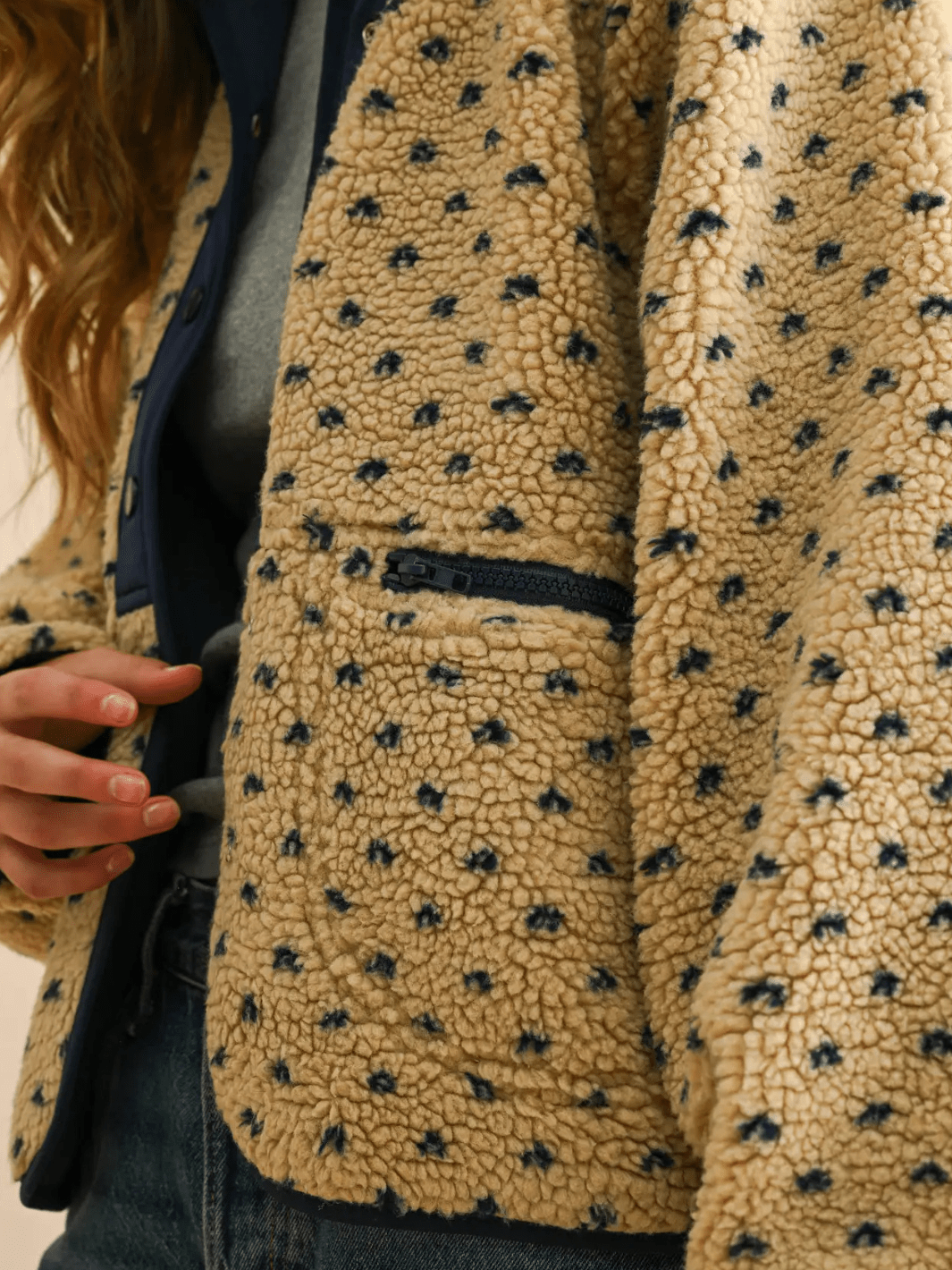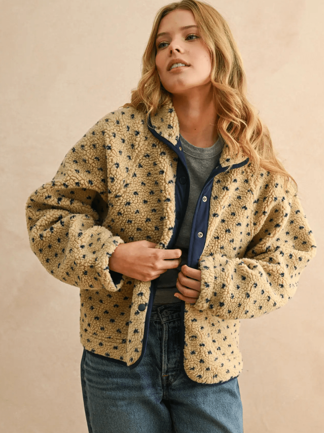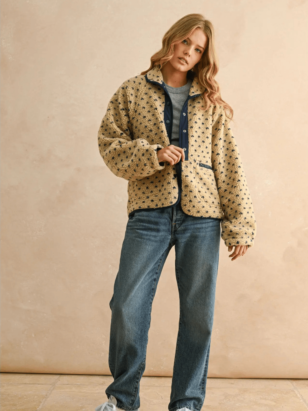 Wrap yourself in warmth and style with the Canyon Bloom Sherpa Jacket. Featuring a plush fleece texture and playful floral dot pattern, this jacket is equal parts cozy and cool. With a button-up front, contrast trim details, and zippered pockets for practicality, it's your go-to layer for chilly mornings, coffee runs, or cabin escapes.