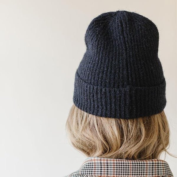 We love the statement fold up + the rose gold Gigi Pip pin on this soft knit, ribbed women's beanie.